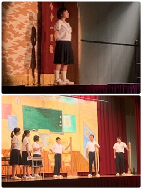 8年生の劇「ぼくたちの教室〜74期生バーション」です。7年生ももうすぐ修了の3月の大掃除の日、生徒たちが掃除を放り出して帰ってしまいました。教室の机やほうきなど、様々な道具たちが集まって嘆いています。その時、時計の針が逆回転します・・・。さて、何が起こったのでしょう?