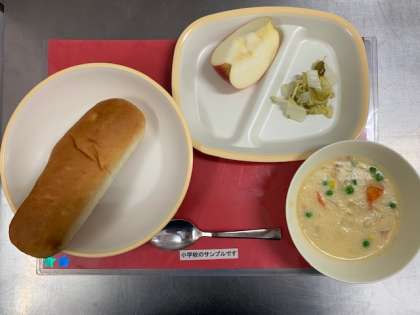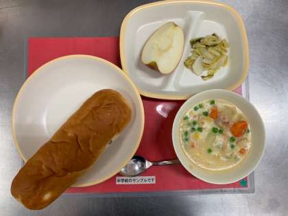 今日の給食は、小学校と中学校共に「おさつパン、牛乳、コーンクリームシチュー(米粉)、はくさいのピクルス、りんご」です。