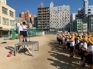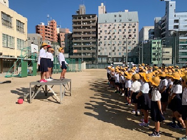 運動委員会からは、「休み時間に使ったボール等のあとかたづけをしっかりしょう。」と声掛けがありました。そして、健康委員会の音頭に合わせて、「あいうべ体操」を全校でしました。
