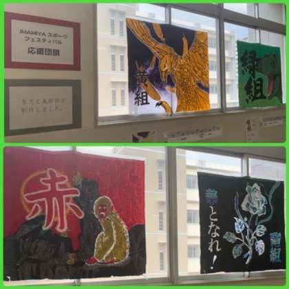 美術室前には、いまみやスポーツフェステイバルの応援団旗を展示しました。