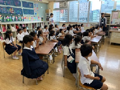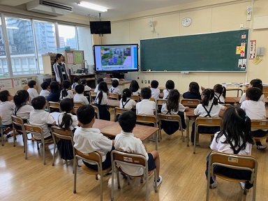 1年生の外国語活動の時間です。1・2組合同で行っています。今日は、世界の行事の中でも「ハロウイン」の動画を見ていました。カナダから編入してきたお友だちに、カナダではどうのようにしていたか、お話ししてもらいました。みんな興味津々。「行きたい。」という声が出ていました。