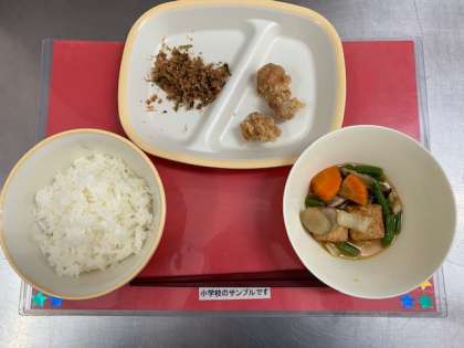 今日の給食は、「ごはん、牛乳、鶏肉のたつたあげ、あつあげと野菜の煮もの、おかかなっ葉」です。