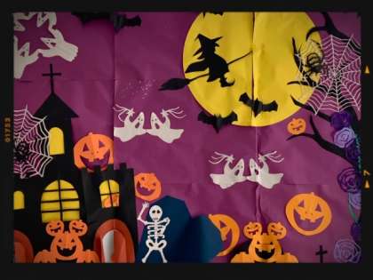階段の踊り場の「季節の掲示物」です。10月は、やっぱり「ハロウィン」!?