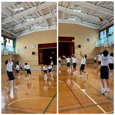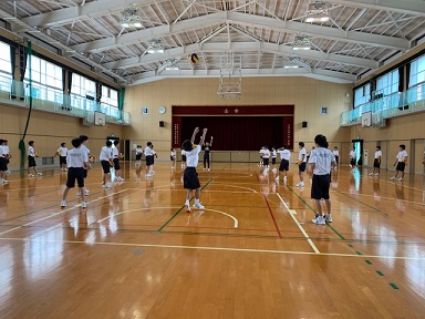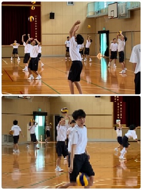 7年生の男子体育の授業の様子です。今、7年生は、「バレーボール」に取り組んでいます。先生から動きのポイントを教えてもらいながら練習しています。
