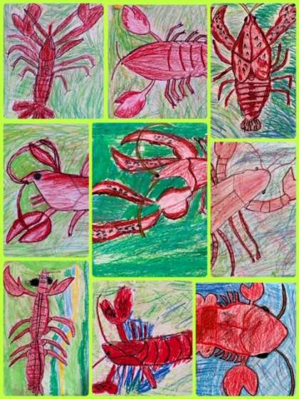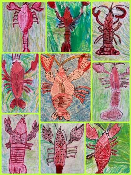 2年生の図工作品「だいすきザリガニ!」です。2年生がお世話をしていた「ザリガニ」を観察しながら描いてくれたのかな。