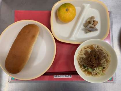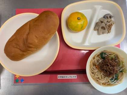 今日の給食は、小学校と中学校共に、「黒糖パン、牛乳、タンタンめん、れんこんのオイスター焼き、みかん」です。