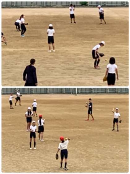 6年生の体育の授業の様子です。ソフトボールに取り組んでいます。今日は、ペアでキャッチボールをしていました。ボールの扱いに慣れるまでが大変なようです。