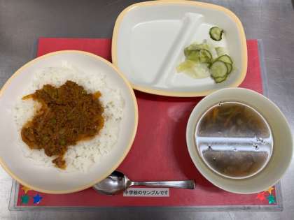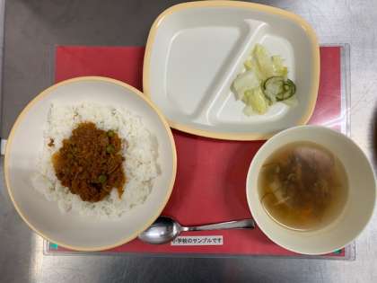 今日の給食は、小学校と中学校共に「牛乳、タコライス、もずくと白ねぎのスープ、キャベツときゅうりのサラダ」です。