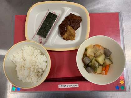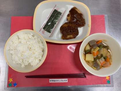 今日の給食は、小学校と中学校共に「ごはん、牛乳、みそかつ、じゃがいもと野菜の煮もの、焼きのり」です。