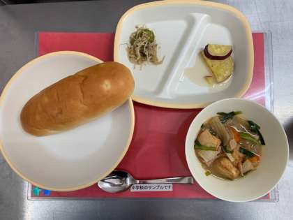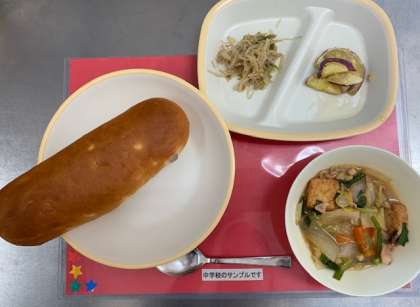 今日の給食は、小学校と中学校共に「おさつパン、牛乳、豚肉といかの中華煮、焼きさつまいもの甘みつかけ、もやしとピーマンのいためもの」です。