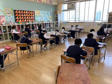 1年2組の国語の授業の様子です。今日の授業の中では、テストをしていました。先生が言った言葉を、正確にていねいに書いていきます。