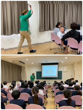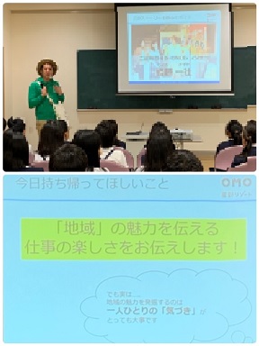 先生の紹介でゲストテーチャーの登場です。今日の授業のめあては「地域の魅力を伝える仕事の楽しさをお伝えします!」です。