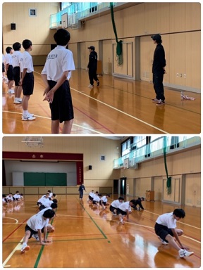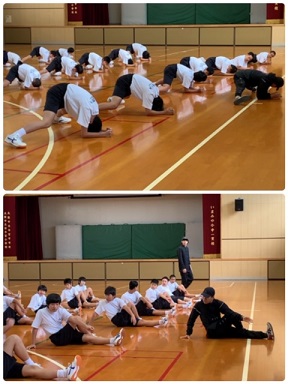 2回目のブレイクダンスの授業です。まずは、普段KAKUさんたちがやっているウオーミングアップを、みんなでやっていきました。
