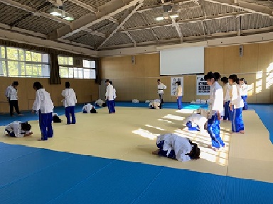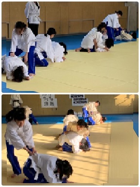 8年生女子の体育の授業の様子です。今、柔道に取り組んでいます。授業のめあては、「固め技に挑戦してみよう」です。固め技の中でも、中学校の授業では「おさえ技」のみ使用することになっています。柔道着を着て、二人一組で取り組んでいます。