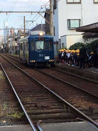 阪堺電車の乗車体験の後、駅員さんから説明を受けています。