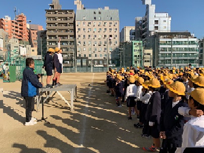 また、今回、4年生児童が、第24回少年少女全日本空手道選手権大会オープントーナメントグランドチャンピオン決定戦においてすばらしい成績をあさめたことで、市長表彰を受けたことを、全校児童に紹介し、表彰状とトロフィーを渡しました。