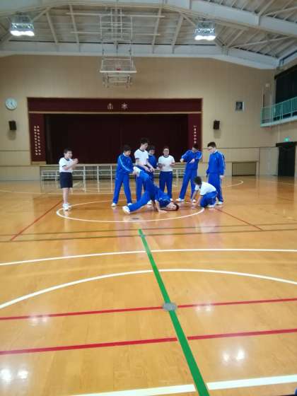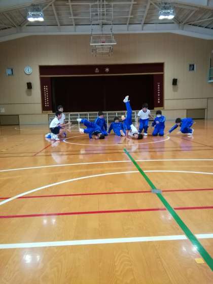 ダンスの授業最終回です。基本の動きに、チームで考えた動きをミックスして作品を完成させました。ウインドミルやチェアーに挑戦し、頑張りました。