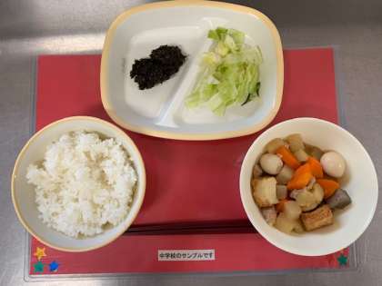 今日の給食は、「ごはん、牛乳、関東煮、あっさりキャベツ、のりの佃煮」です。