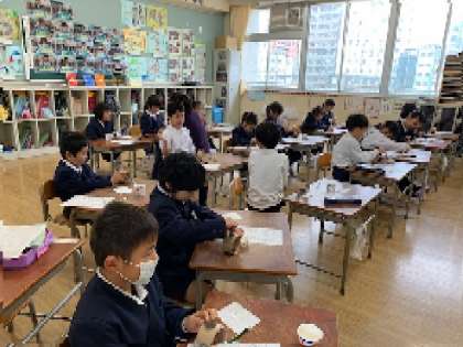 課題「どんぐりでトトロをつくろう!」に取り組んでいます。ボンドが乾くのが、待ちきれないよう!