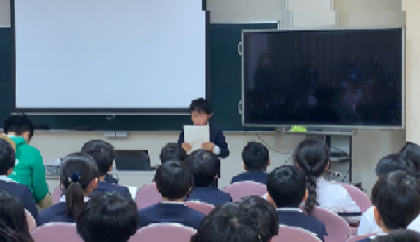 児童代表のあいさつで、これから各班のプレゼンが始まります。班ごとにテーマを決め、プレゼン方法も工夫しています。