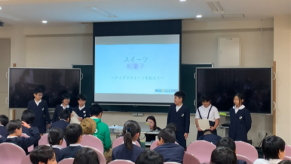 続いての班は、「スイーツ × めぐり」をテーマに調べてきてくれました。インタビュー動画とクイズでプレゼンをしてくれます。題して「スイーツ 和菓子 〜クイズでスイーツを知ろう〜」です。