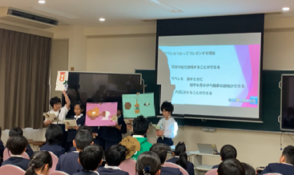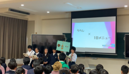 4年生のプレゼンの続いての班は、「ちらし × 1日メニュー」を考えました。「新今宮 食べつくしガイドブック SHIN−IMAMIYA」と称して、工夫したちらしを作成しました。