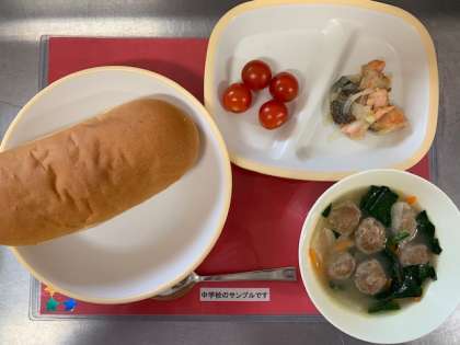 今日の給食は、小学校と中学校共に「黒糖パン、牛乳、さけのマリネ、肉だんごと麦のスープ、プチトマト」です。
