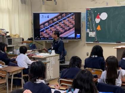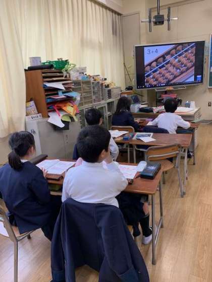 電子黒板を活用して、そろばんを使っての計算の仕方を習っています。今日の例題は、「3+4」の計算です。「1のたま」だけでは計算できないときにどうするのかを覚えています。