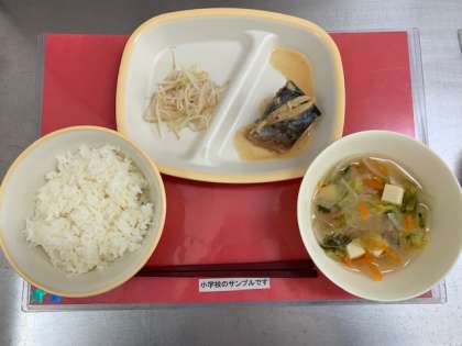 今日の給食は、「ご飯、牛乳、さばのみそ煮、もやしのゆずの香あえ」です。中学生は「焼きのり」が加わります。