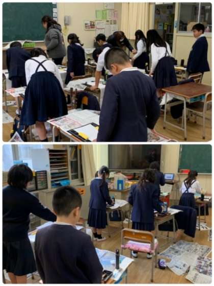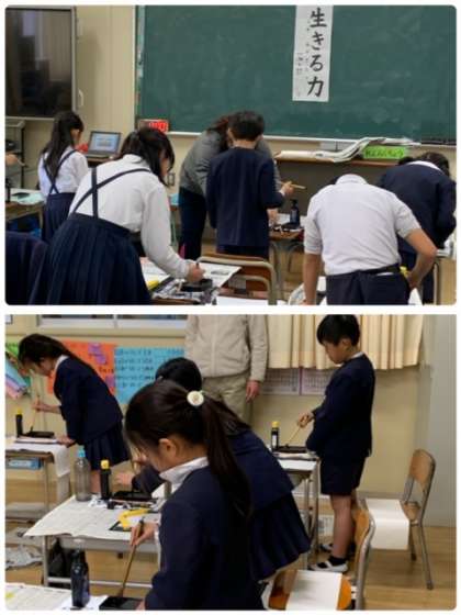 3年2組の書道の授業の様子です。今日は、書初め用の長い半紙を使って「生きる力」を書きます。まずは、見本の字でイメージをつかみます。