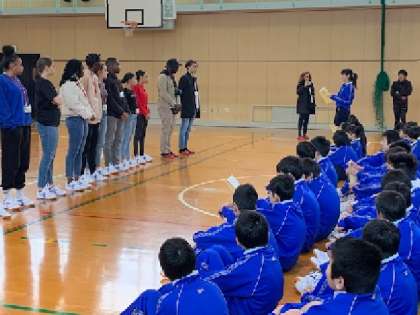 体育委員・学級代表・その他有志より、あいさつをしました。あいさつは、日本語と英語で。日本の学校の様子を紹介し、そして歓迎の意を伝えました。LE PACK(ル パック)の皆さんからもあいさつがありました。