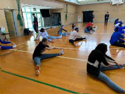 日本の中学校の体育の授業体験として、授業の初めのランニング・ラジオ体操・柔軟・腹筋・腕立て伏せを一緒に体験してもらいました。とても新鮮に感じてくれている様子でした。