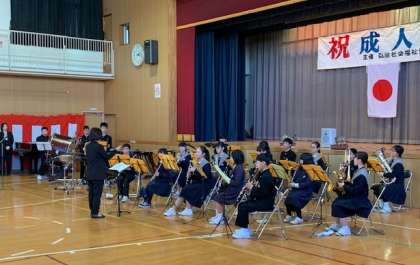 再び、全員での演奏です。曲は「RPG]「マリーゴールド」「やってみよう」と続きます。新成人の皆さんも、演奏に集中して聞いてくれました。中には、体でリズムをとっている人も・・。