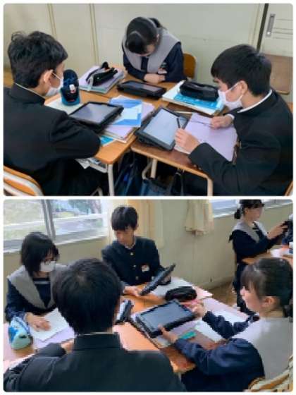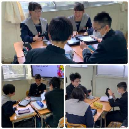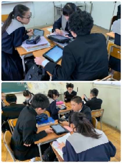 自分の英語の詩を作り始めました。まず、テーマを選び、タブレットのマッピング図を活用して、イメージを膨らませていっていました。最初に一人で、次に班になって互いに交流し、必要に応じて、友達のアイデアも借りていました。英語のスペルに自信のないときは、インターネットで調べたり…タブレットの活用が活かされていました。