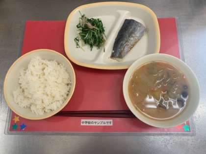 今日の給食は、小学校と中学校共に「ごはん、牛乳、さごしのしょうゆだれかけ、みそ汁、みずなの煮びたし」です。