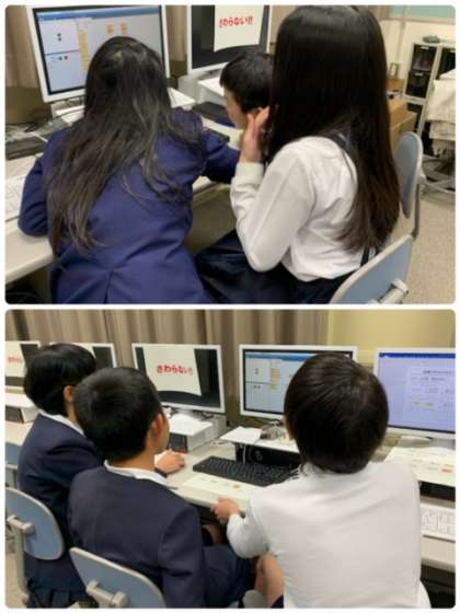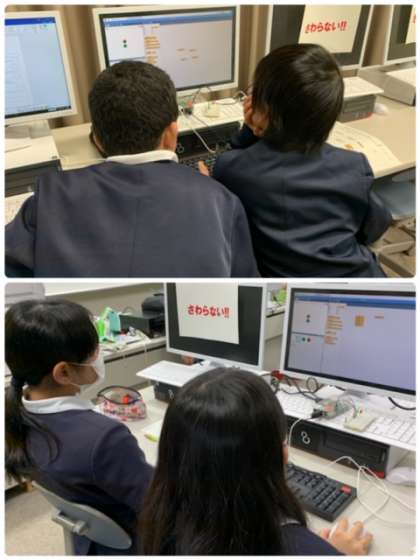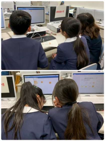 「信号機について」のプログラミングを学習しています。信号機の赤信号から青信号に変わるところをプログラミングしました。どうしたらうまく作動するのか、2〜3人のグループで相談しながら取組んでいました。