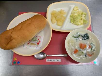 今日の給食は、小学校と中学校共に「コッペパン、牛乳、ほうれんそうのクリームシチュー、キャベツのサラダ、洋なしのカット缶、りんごジャム」です。