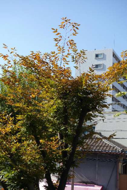 今宮の森にも秋の気配がひたひたと押し寄せてきています。まだほとんどの木々は青々としていますが、一部色づきつつある木も見受けられます。