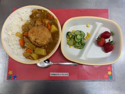 今日の給食は、「ポークカレーライス、きゅうりとコーンのサラダ、いちご、牛乳」です。中学生は「チキンレバーカツ」が加わります。