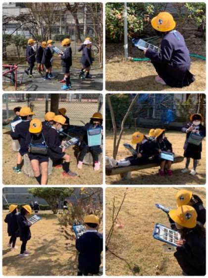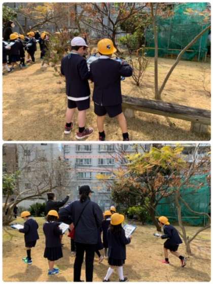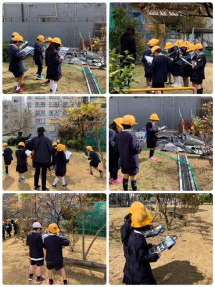 これまでに観察した樹木や花の様子を見て、ワークシートにチェックしていきました。また、新しく発見したものを書き加えたり、気に入った花の絵を描いたりしていました。特にバラの花に人気が集まっているようで、「きれい!」という声が聞こえてきました。また、いつも公園の手入れをしておられる町会長さんにも質問をいっぱししていました。
