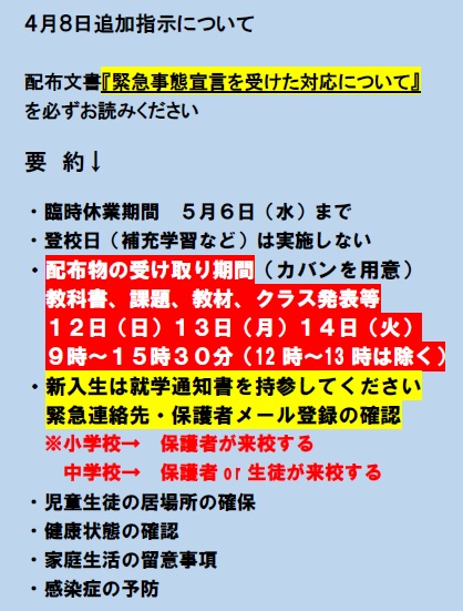 児童生徒にとって大切な教育活動が受けられない状況にありますが、配布文書の内容にもありますようにご留意いただき、活動が再開される5月7日からはスムーズに学校生活が送れますようにご協力いただきたいと存じます。ご不便をおかけして申し訳ありませんがよろしくお願い申しあげます。