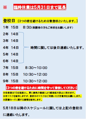 臨時休業の延長・登校日については上記の通りですが、詳しくは次の文書となりますので必ずお読みください。