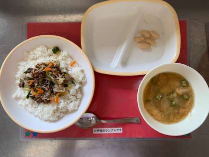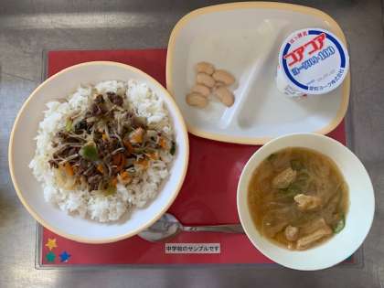 今日の給食は、「牛丼、とうがんのみそ汁、大福豆の煮もの」中学生は「ヨーグルト」が加わります。