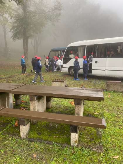 今から、体育館に行き、焼き板を作ります。二台のマイクロバスで移動です。