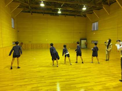 みんなが作った紙飛行機で、班対抗で大会です。どこの班が一番遠く飛ばすか?
