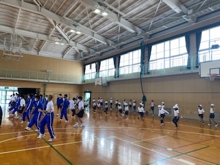 今日は8年生男子が体育授業のダンスを「MOTAL COMBAT」さんに来てもらい、ブレイクダンスを教わる日でした。