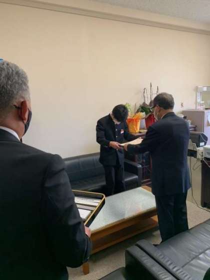 本来なら税務署にて、表彰式がおこなわれるのですが、コロナの影響で校長室でとなりました。