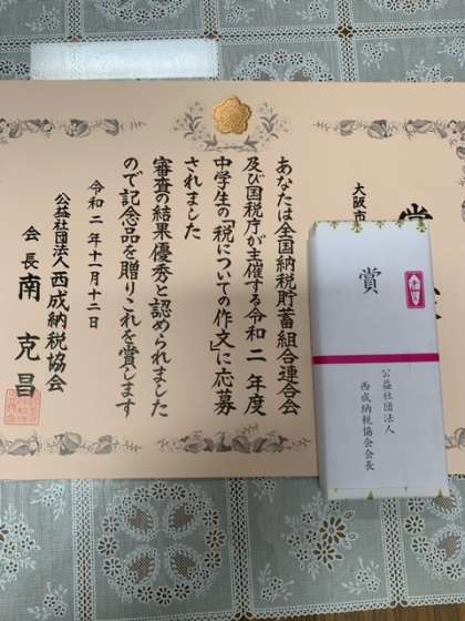 9年生の生徒が税の作文で、表彰されました。