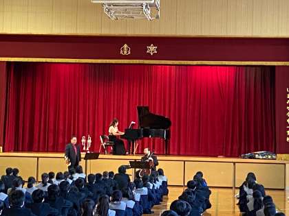 西成区に活動拠点を持つオーケストラの大阪フィルハーモニー交響楽団の出前授業がありました。中学生は、木星のファンタジーや鬼滅の刃などの曲に聴き入っていました。
