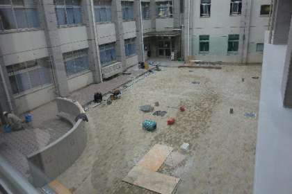 サブグラウンドの手洗い場が仕上げに入っています。中庭はタイルが敷き詰められました。